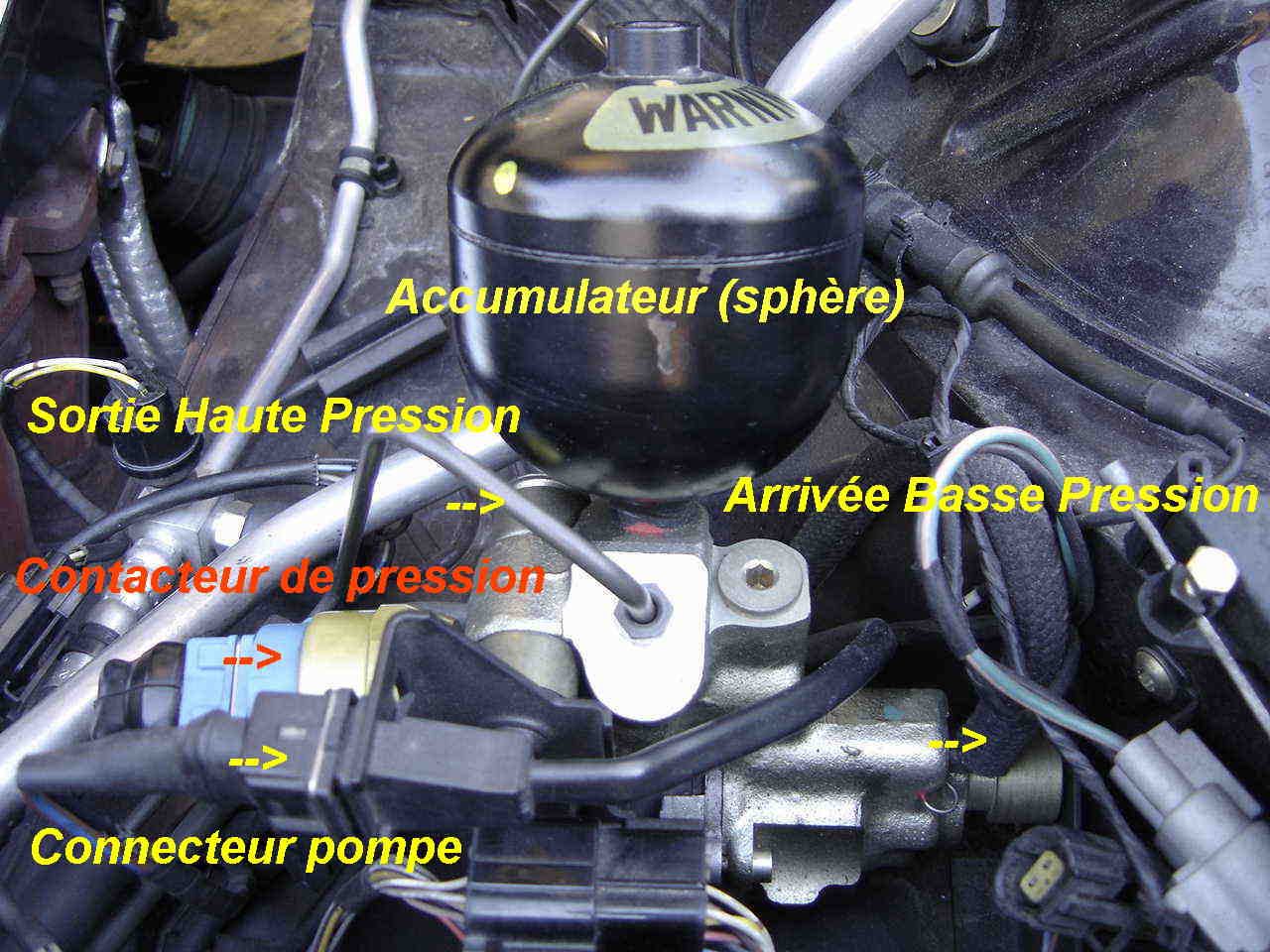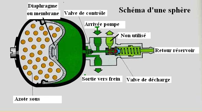 ![]() Lorsqu'on met le contact la pompe démarre et recharge le circuit en remplissant la sphère d'huile. La sphère est composé d'une membrane où est emprisonné de l'Azote. Le volume d'huile dans la sphère permet d'assurer plusieurs freinages appuyés en toute sécurité et d'éviter d'avoir le fonctionnement de la pompe en permanence.