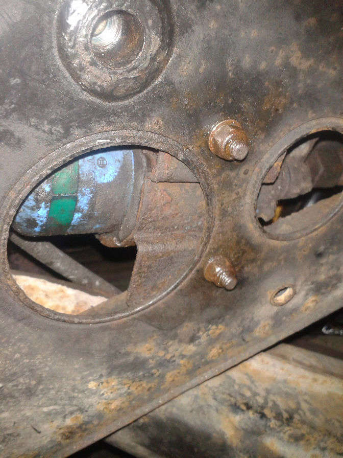 ![]() A ce moment-là, on peut déjà dévisser le support métallique où est logée la pompe (2 écrous de 10 avec rondelles), sous la traverse horizontale arrière et une vis de 8 avec rondelle en haut du support. Il y a un cylindre en caoutchouc (n°7) qui protège le corps de la pompe à l'intérieur du support métallique :