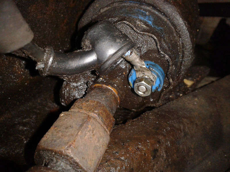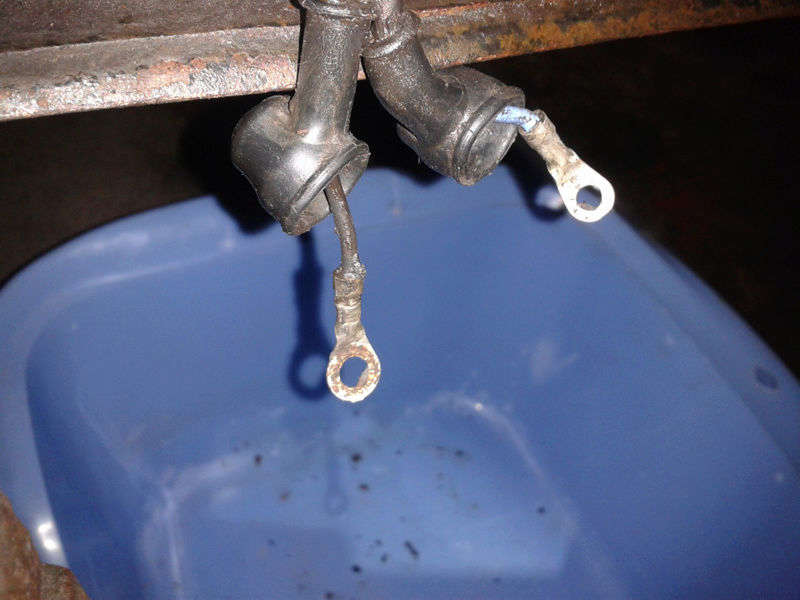 ![]() Enfin, après avoir repoussé les capuchons en caoutchoucs noirs, il n'y a plus qu'à dévisser les 2 écrous de 7 ou 8 (avec rondelle étoile) qui maintiennent les cosses des fils électriques sur la pompe. Le fil noir sur le "moins" (gravé sur la pompe) et le fil bleu sur le "plus". De plus les diamètres des boulons son différents :